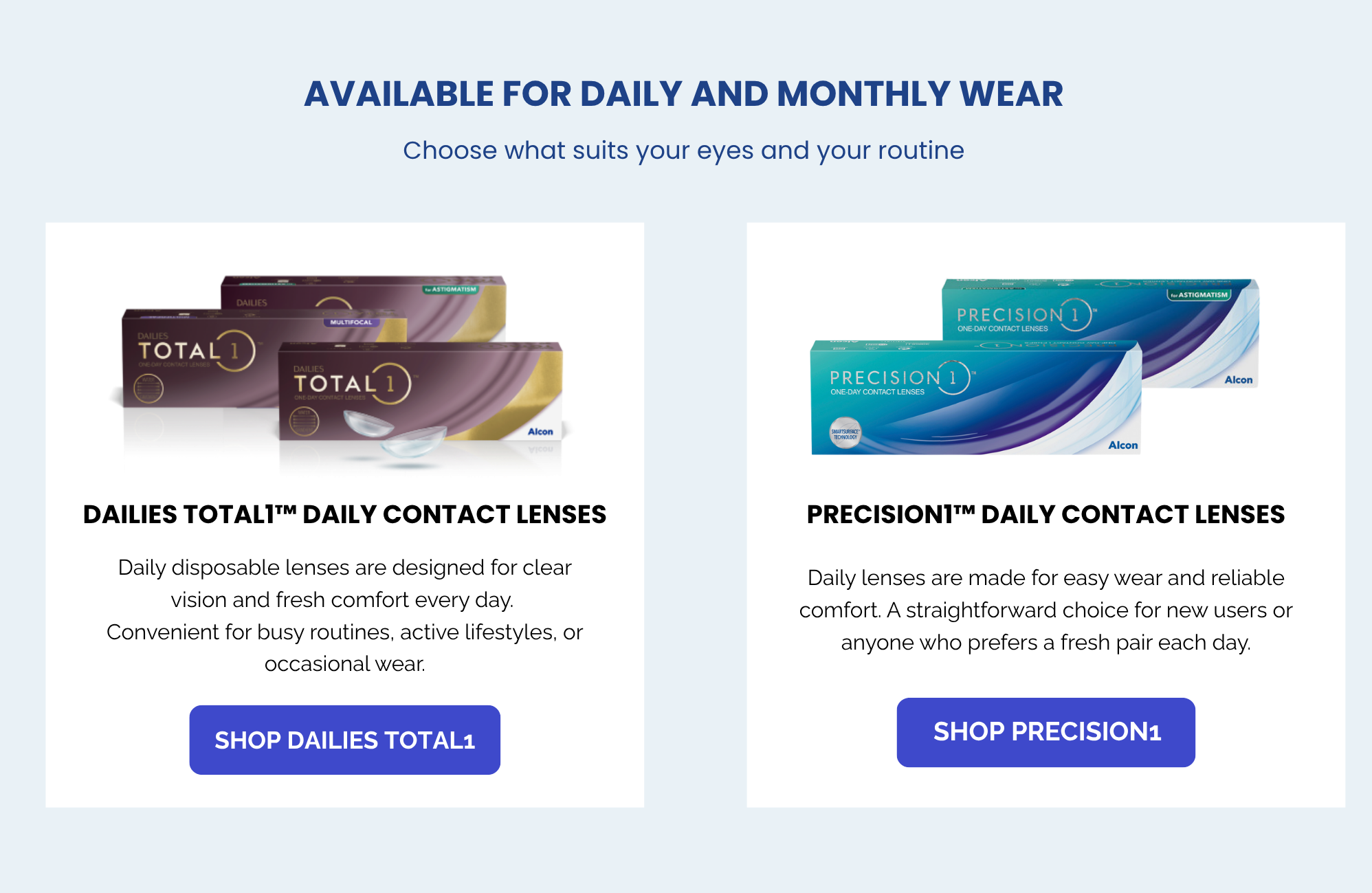 Daily & Monthly Convenience – Choose between the ultimate ease of daily disposables (Dailies Total 1, Precision 1) or the reusable comfort and value of monthly lenses (Total30).
